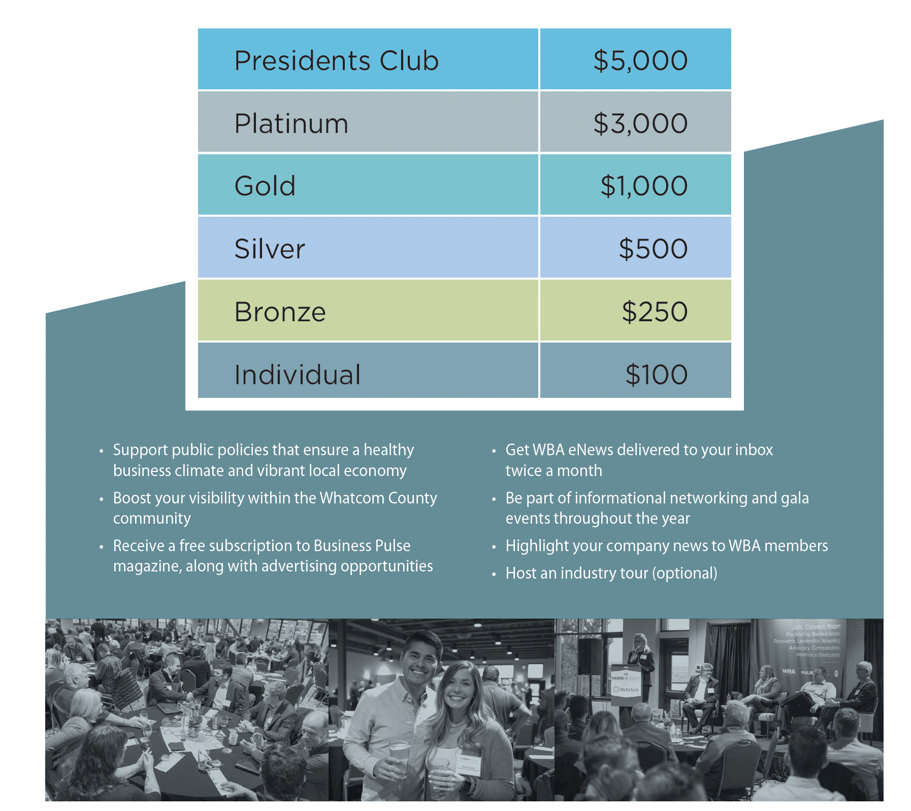 The WBA promotes and preserves private enterprise. By creating a strong network of leaders, the WBA provides our business community a relevant and influential voice on issues impacting the quality of life for everyone in Whatcom County.